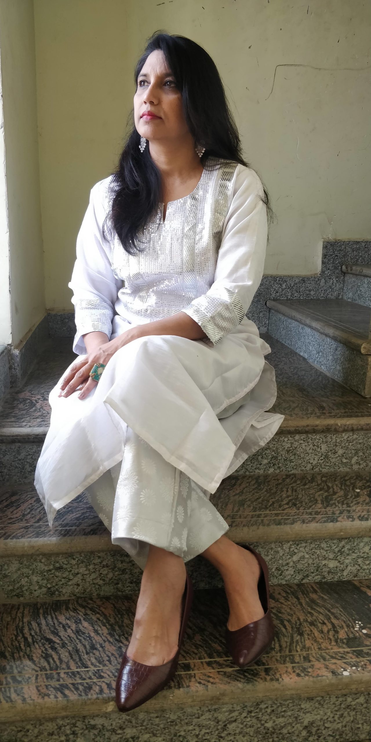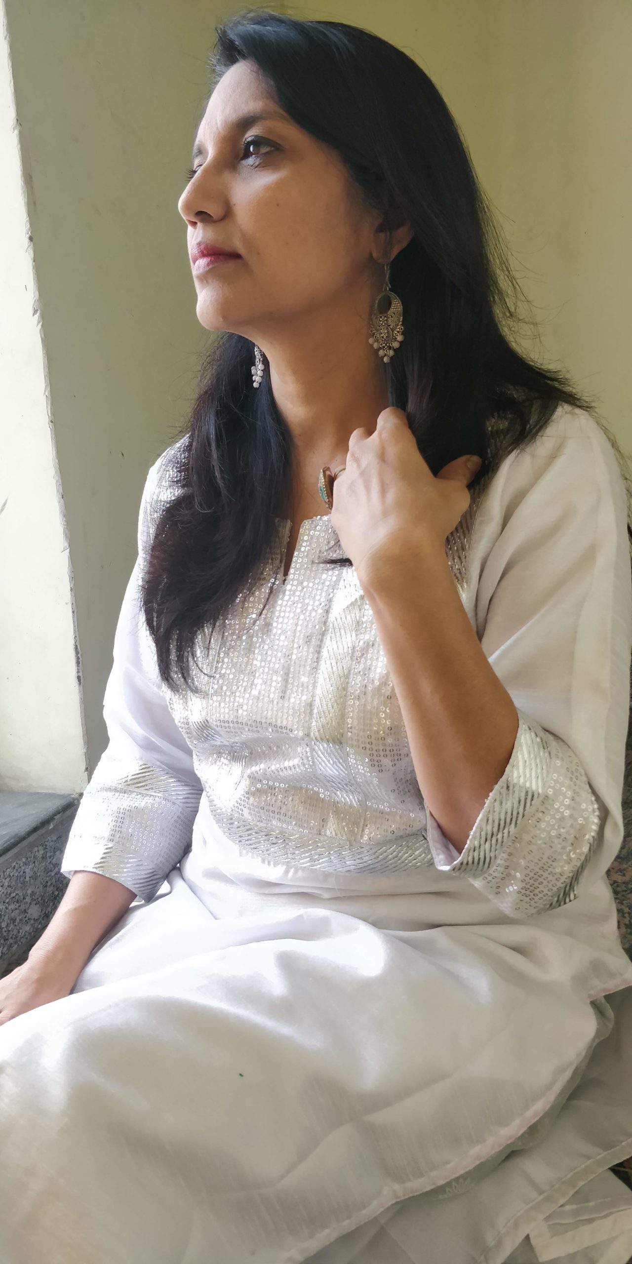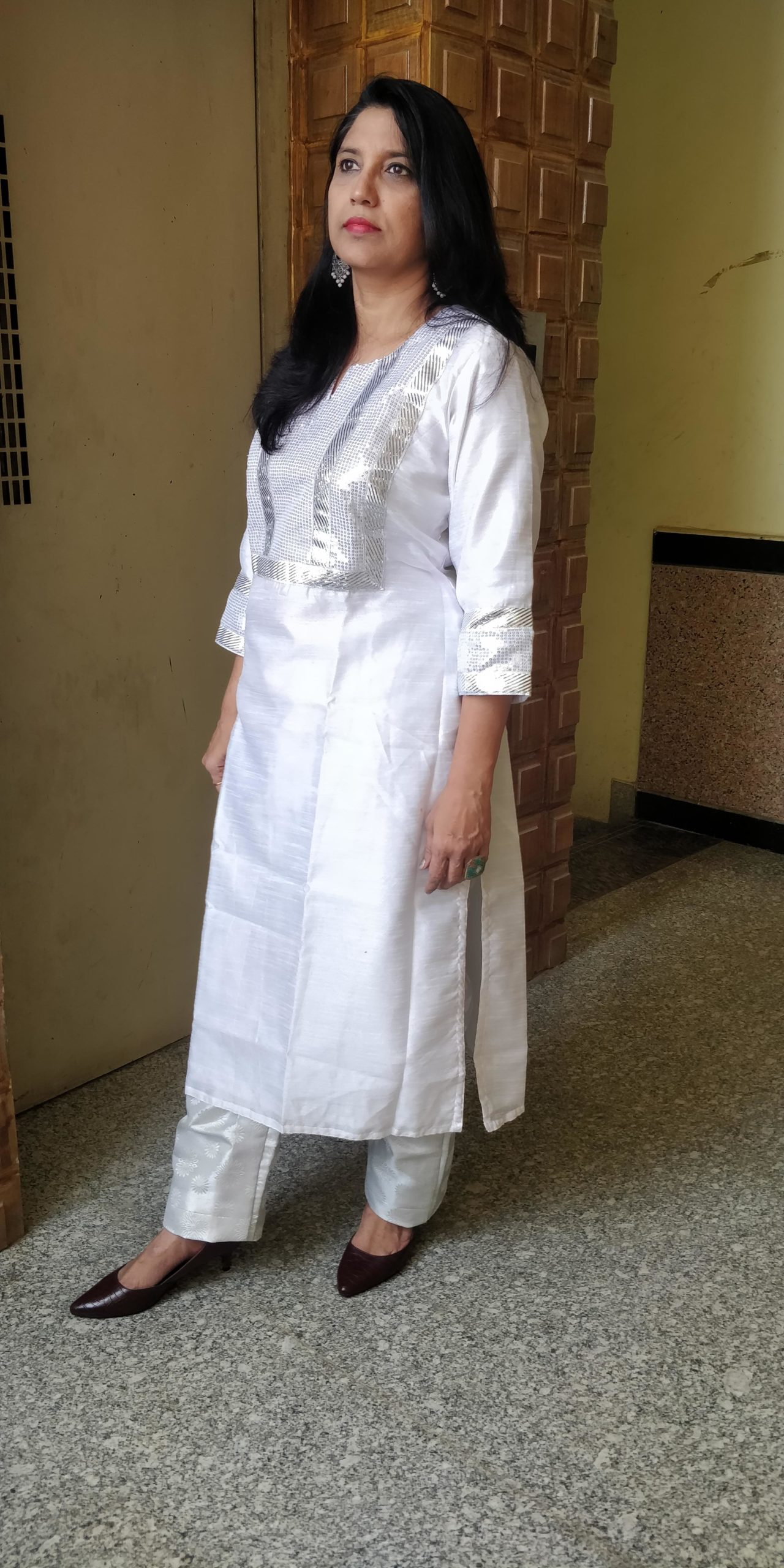 Kurta in white raw silk with sequin work in silver on the yoke and self printed silver Brocade straight pant looks chic. The white colour and silver looks awesome and suttle too. It is best suited to match any occassion.